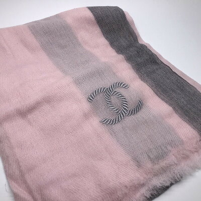 [USED/中古]CHANEL シャネル ストール カシミヤガーゼ大判ストール ピンク×グレーライン 刺繍ココマーク カシミアガーゼ Bランク【中古】