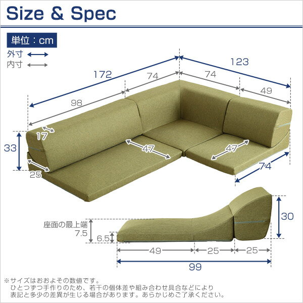 1P、2Pの背もたれを倒せば、横になるのにちょうどいい角度に!ファブリックの落ち着いた5カラーからお選びいただけます! 商品名コーナーフロアソファ ロータイプ ファブリック 3人掛け(5色)組み替え自由 サイズ1人掛け:(約)幅49x奥行き74x高さ33cm(座面高:7.5cm) 2人掛け:(約)幅98x奥行き74x高さ33cm(座面高:7.5cm) コーナー:(約)幅74x奥行き74x高さ33cm(座面高:7.5cm) ※商品重量:(約)14.2kg 材質ソファ中材:ウレタンフォーム(モールド成型) カバー:ポリエステル100% 備考・完成品でのお届けです。