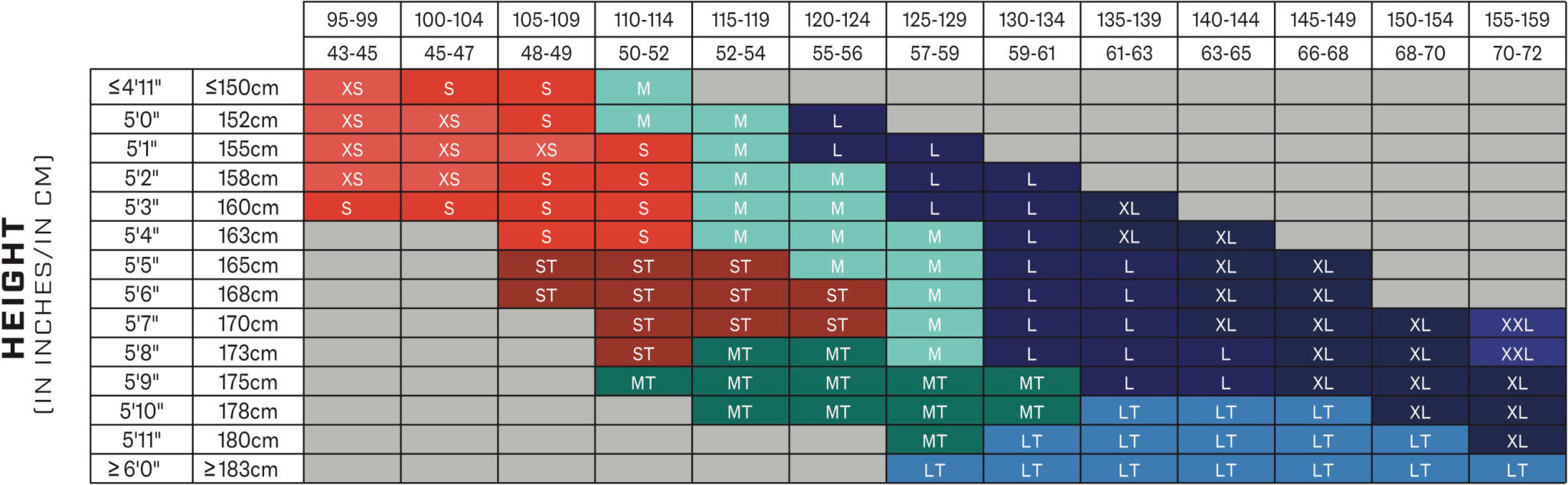 ・製品の特性上、本来は多少きつめに感じることが普通ですが、水中での肩の動きや呼吸が制限されてしまうと予測できる場合には、一つ上のサイズをご検討ください。